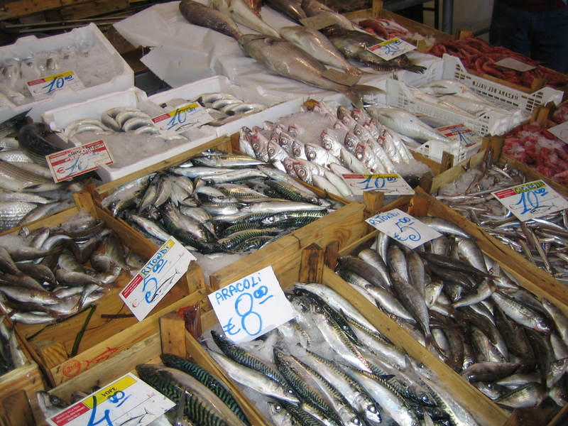 8 o’clock Saturday morning. I’m at the Trapani fish market, a covered warehouse close to the fish docks. Local buyers poke and prod at the catch to make sure they get the freshest possible. There are huge swordfish on display, and tiny needlefish called cigarillos. Red mullet, anchovies and sardines figure prominently in Sicilian cuisine. It’s not tuna season just yet, but at some stalls you can find tuna steaks carved from a carcass frozen at sea. Or something called bottarga, which the compressed, salted and dried eggs of the tuna. It can be sliced or grated on to cooked pasta for a salty kick.