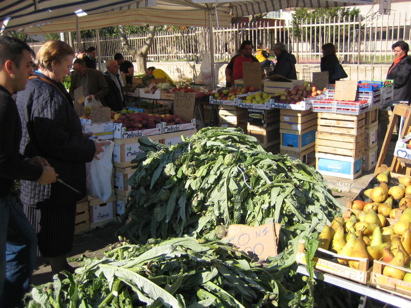 From the fish warehouse I stepped out of a narrow doorway right into a raucous open produce market. This time of year there were huge bulbs of fresh fennel, artichokes, still attached to their long stems. Fava beans, and oranges from nearby provinces were also on display.