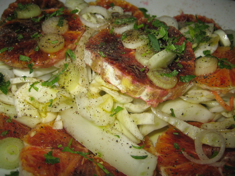 The fennel and oranges are thinly sliced, and with a little bit of chopped celery, olive oil, and salt, make an excellent salad.