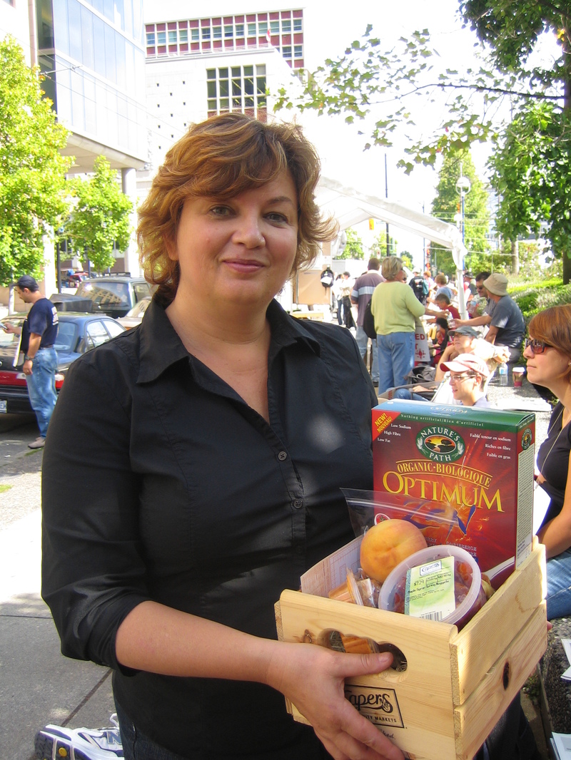 Good Things: Thursday morning on the picket line I received a visit from Victoria Pawlowski, the nutritionist from Capers Community Markets.  Img_0808 Victoria and Capers Community Marketing Coordinator Trish Kelly brought along a beautiful basket of healthy foods that make more sense to snack on than loading up on some of the sugar and fat-laden temptations.  Highlights of the basket included some wild salmon chunks that had been cured with maple syrup, the No Chocolate Cookie Power Pack, some tofu sesame strips, and a duet of delicious salads.  The first consisted of lentils, onion and tomato, very similar to those that Margaret Gallagher had concocted earlier in the week, and my personal favourite, a crunchy concoction using whole kamut and spelt as the Img_0809base. Kamut and spelt are known as ‘ancient grains’ and are suitable for people who have celiac disease or are gluten intolerant. (wrong! Victoria wrote me after this was originally posted to tell me spelt and kamut are part of the wheat family and as such, are not recommended for celiacs) The cookie power pack also employed spelt flour, along with oats, raisins, sunflower, flax and pumpkin seeds, even some hempnuts.  Tasty and very filling.  Victoria stressed the importance of eating a breakfast with some good protein before heading to the picket line and had lots of advice regarding the kinds of foods you can eat while exercising that will help with weight loss.  Listen for details on one of my upcoming podcasts.  Marie-Helene Robitaille has been careful with her diet on the line, Img_0811 and Thursday was no exception, as she brought along a green salad laced with canned tuna and other crunchy veggies.  Other good things:  Fresh vegetables grown by the grandfather of a locked-out employee and beautiful chunks of watermelon. Img_0814 Now for some BAD THINGS: